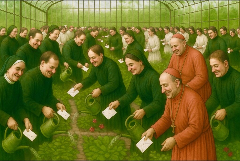 Rainhard Wedeleit (Vineyard-Bewegung), einer der drei Sprecher des CCD, führte aus, wie er im Vorfeld der Konferenz ein inneres Bild von Jesus zum Miteinander der christlichen Leiter und Leiterinnen empfangen hatte: Er sah ein Gewächshaus, in dem es ein ständiges Hin und Her von Leitungspersönlichkeiten aus verschiedenen Kirchen und Bereichen gab. Das Besondere daran: Sie kümmerten sich um die Pflanzen und die Beete der anderen und nicht um die eigenen, indem sie diese gossen und den „Kollegen“ Zettel mit Botschaften zusteckten. Wedeleit generierte daraufhin mit Hilfe von KI eine Darstellung, die diese Szene bildhaft vermittelt.