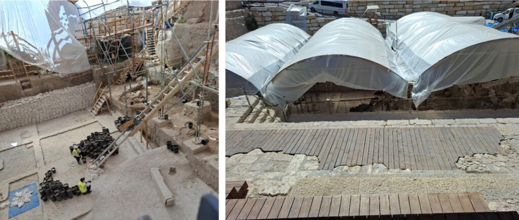 Doch jetzt eröffnen sich dort tolle Perspektiven: Die Griechisch-Orthodoxen haben den Garten freigegeben, die Archäologen legen unter einem riesigen Zelt gerade das große Becken des Teiches frei. Wir konnten sehen, wie die Ausgräber Eimer um Eimer mit Erde und Steinen füllten und abtransportieren, und erhielten einen sichtbaren Eindruck von der Größe und der Pracht des Teiches Siloah, der die antike Stadt Davids mit Wasser versorgte.